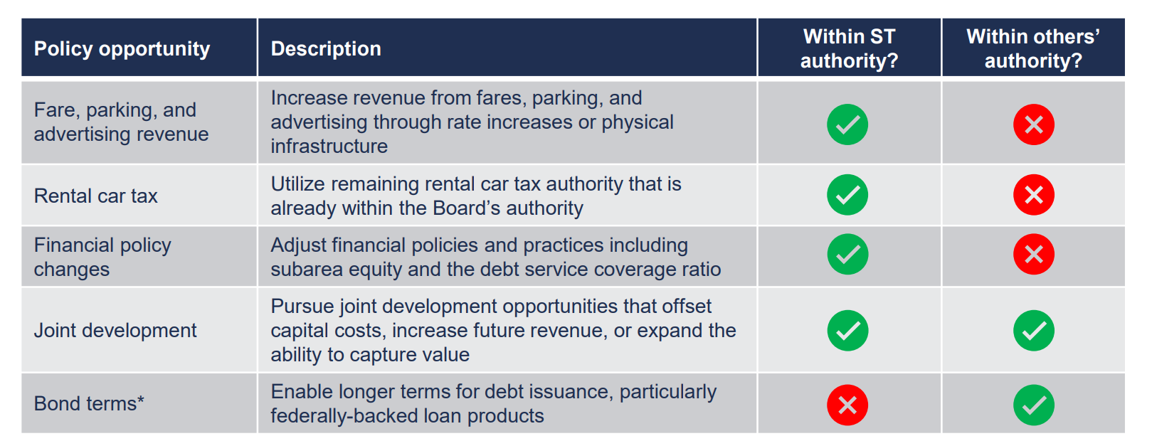 Sound Transit is also looking at policy levers that can be pulled independently of direct decisions around service expansion or operations.