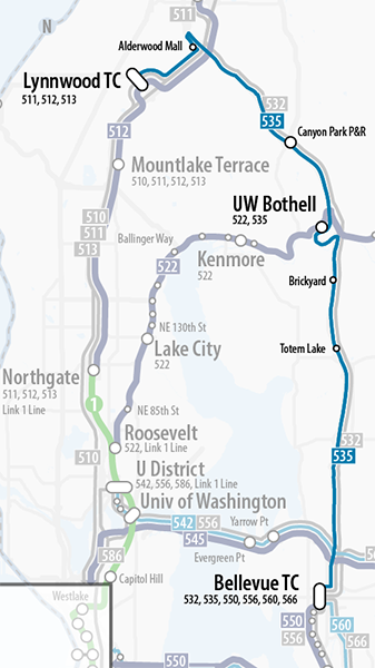- Route 535 (Lynnwood-Bellevue) would benefit from new Sunday service and increased Saturday frequencies. Sunday service would be every 30 minutes during the day and hourly in the late evening. On Saturdays, frequency during the day would improve from hourly to every 30 minutes. This would give a fairly consistent schedule across the week. Lynnwood is a booming center and poised to get an I-405 running bus rapid transit line this decade, so this service improvement is highly justified.