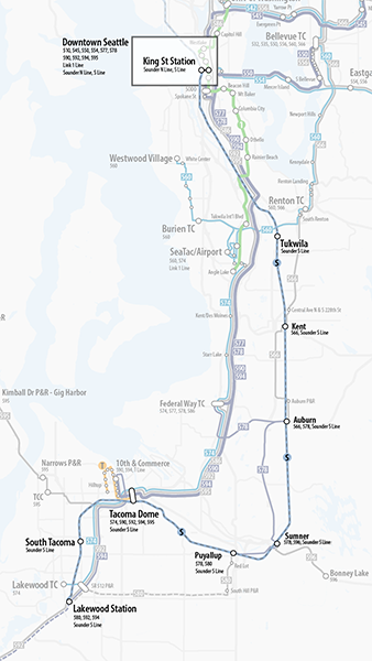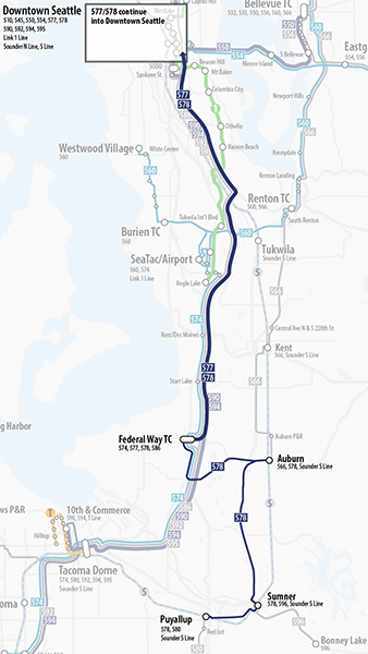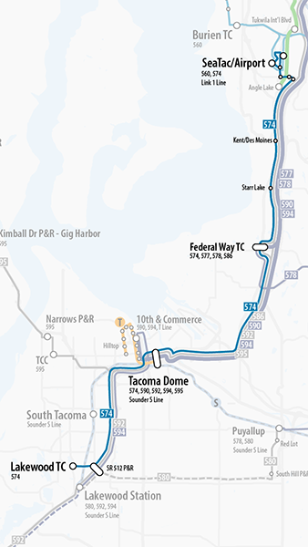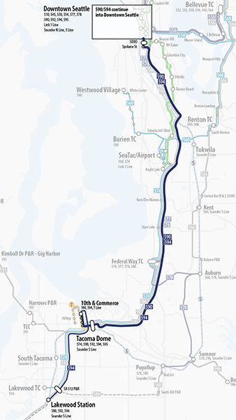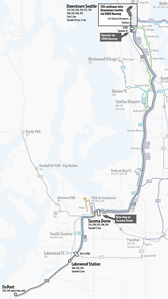 The proposed South ST Express service changes shake out as follows:Route 574 (Lakewood-SeaTac) would benefit from a wider span of service starting earlier and ending later so that airport workers have more choices to commute via transit. All other service levels would remain the same.Route 577 (Federal Way-Seattle) would benefit from increased frequencies during weekday middays and during weekend days. This would improve those frequencies from every 30 minutes to every 15 minutes. When combined with Route 578, this gives riders 15-minute or better service from Federal Way to Seattle all day, except early morning and late evenings, seven days a week.Route 578 (Puyallup-Seattle) would benefit from additional frequency on weekends during the day, improving from every hour to every 30 minutes.Routes 590/594 (Tacoma-Seattle/Lakewood-Seattle) would provide a combined benefit from increased frequencies during weekday middays and weekend days, improving from every 30 minutes to every 15 minutes from Tacoma. This gives riders 15-minute or better service from Tacoma to Seattle all day, except evenings, seven days a week.Route 592 (DuPont-Seattle) would benefit from a new stop at Tacoma Dome. This would allow for other local and regional transit connections in Tacoma that the route doesn’t offer today. The route would also be adjusted in Seattle to operate on the SoDo Busway with new stops, including at Stadium Station and International District/Chinatown Station.Additionally, Sound Transit is planning other service improvements that benefit Pierce County and South King County riders with the following changes:T Line (Tacoma Link Streetcar) is expected to open with an extension in May next year from Downtown Tacoma to the Tacoma Hilltop neighborhood. Frequency on the line is proposed to improve from every 12 minutes to every 10 minutes.S Line (Tacoma/Lakewood-Seattle Sounder) would benefit from its full slate of pre-pandemic trips being restored by September 2022. Nine trips currently operate with two additional ones planned for restoration this September (Train 1507 at 2:35pm from Seattle to Tacoma and Train 1520 from 4:06pm from Tacoma to Seattle). This would mean two more trips return next year for the full daily weekday 13 trips.Sound Transit proposes a handful of other ST Express bus service enhancements: