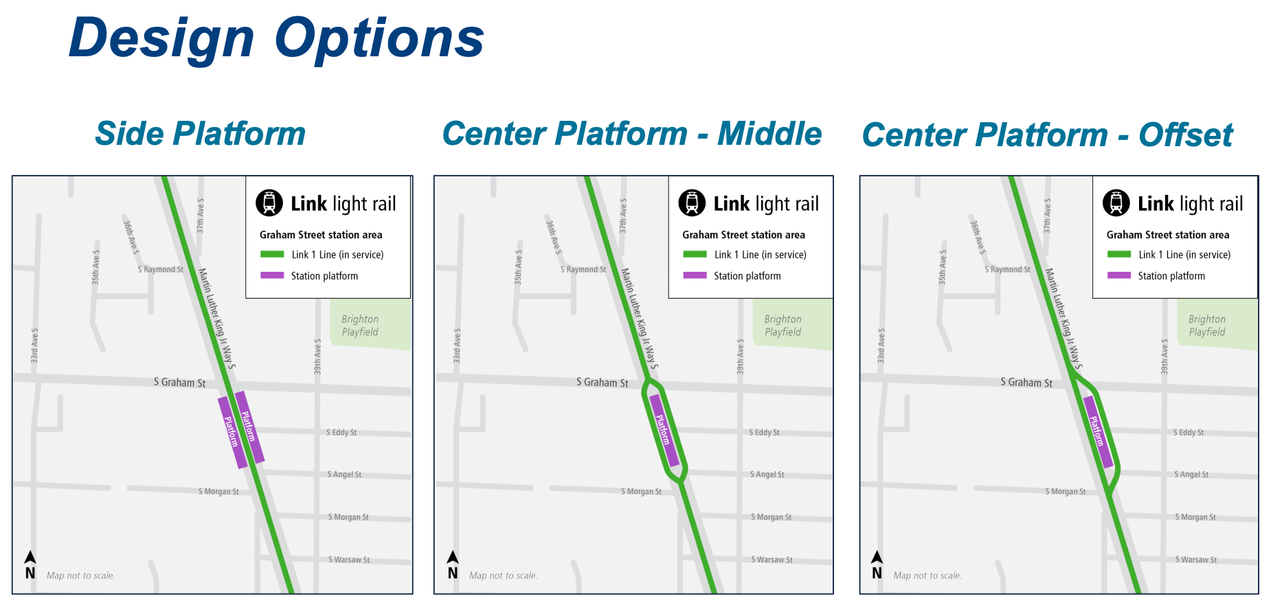 Sound Transit considered numerous locations near S Graham Street for a station on Martin Luther King Jr. (MLK) Way S during the early planning process. “These included platforms north of Graham, south of Graham, and split north and south of Graham,” Macik said.