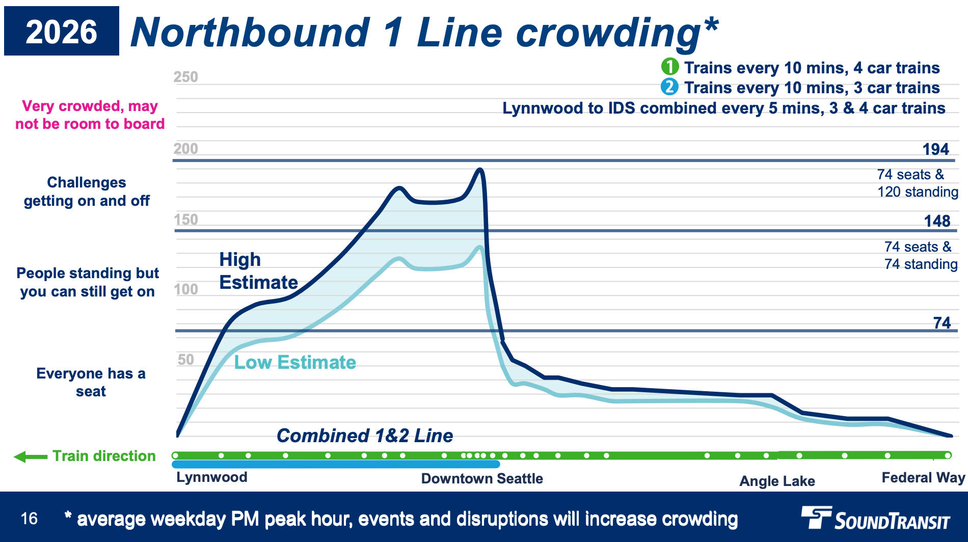 Things are expected to improve between Downtown Seattle and Lynnwood once the 2 Line is able to start running through Seattle, potentially in 2025, by essentially doubling frequencies alongside the 1 Line. The 2 Line will only be running three-car trains, but the 1 Line could be restored to four-car trains if all goes well. Overall though, peak frequencies won’t be able to attain the planned eight-minute headways — every 10 minutes may be the best case per line — and crowding could be a common problem in the system core.