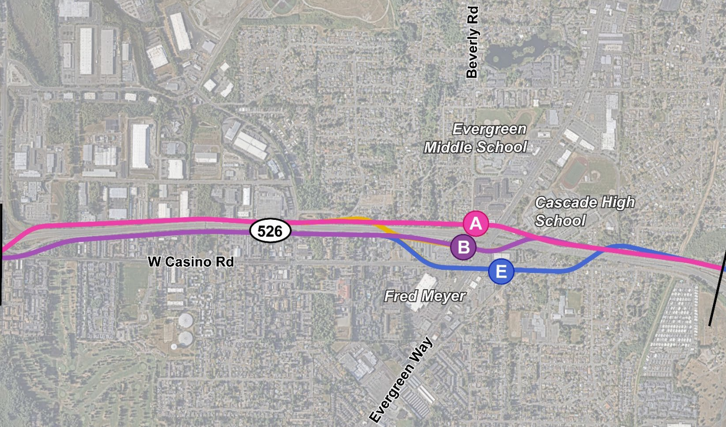 Thursday’s presentation showed just how optimistic Sound Transit’s capital delivery team is when it comes to getting Everett Link into a more affordable cost range, with a series of changes that probably should have been part of the design all along. The most significant adjustment would be a change to the light rail guideway’s alignment on Evergreen Way to utilize more highway right-of-way, avoiding building demolitions.