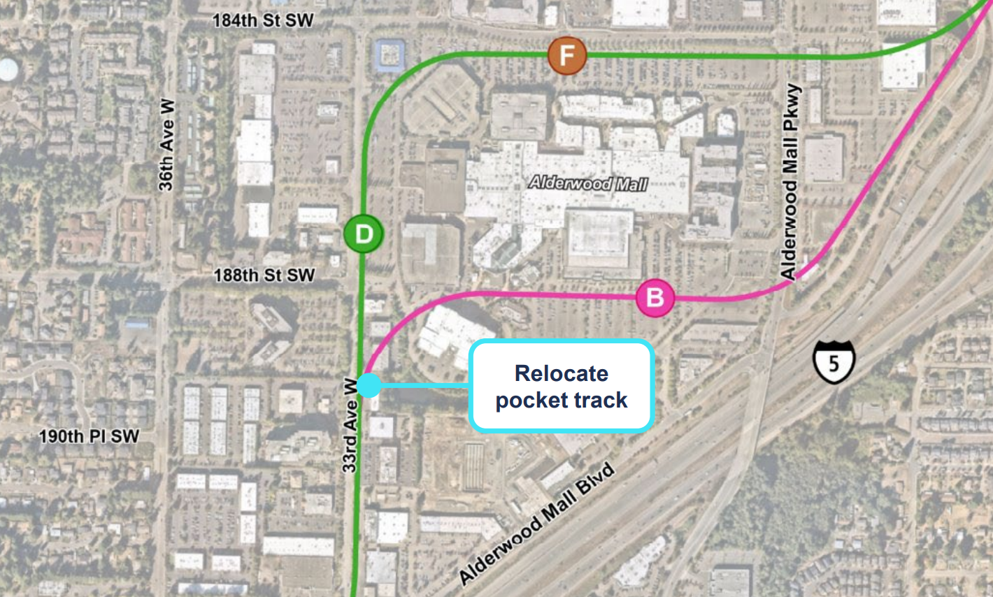 Sound Transit also thinks it can save up to $85 million around Lynnwood’s Alderwood Mall, by eliminating a wide “pocket track” near what will be Lynnwood’s second light rail station. A pocket track is a stretch of rail separate from the main line where trains can be stored temporarily, either in the case of service disruptions or to provide additional service for special events. But eliminating the pocket track here, Sound Transit can avoid having to acquire properties belonging to 24 different businesses.