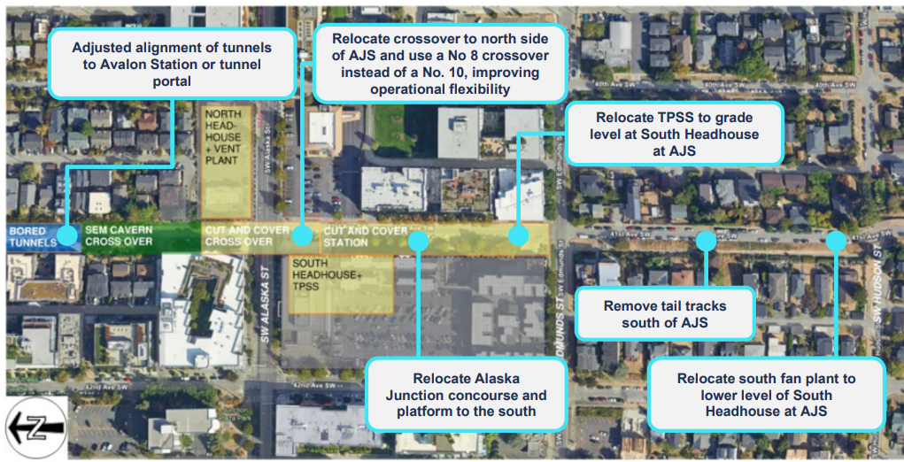 Another item in the “why weren’t we doing this before” category are some changes to West Seattle Link’s terminus at Alaska Junction, removing tail tracks south of the station and relocating the station concourse and platform. Avoiding the need to demolish “basically a full block” of the Junction neighborhood, Sound Transit would also gain operational efficiency in a way that could save around 3 minutes per trip in terminal processing time. And the dollar figure saved could be as much as $235 million dollars.