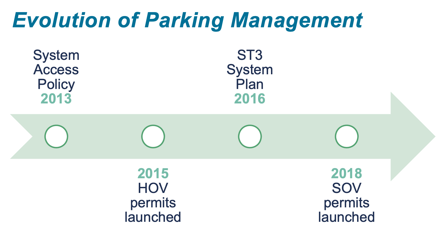 Sound Transit’s parking management programs have been evolving over the years. Much of it started with the initial System Access Policy in 2013. At that time, the agency established several key policies for how parking facilities were to be used and operated. First among these is that parking is meant for transit riders only during the day. The policy also stipulated that parking management tools like permits, fees, and technology could be used and that parking rules would be enforced through warnings, infractions, and towing. This eventually led to the adoption of a monthly high occupancy vehicle (HOV) parking permit program for carpoolers in 2015 at some parking facilities.
