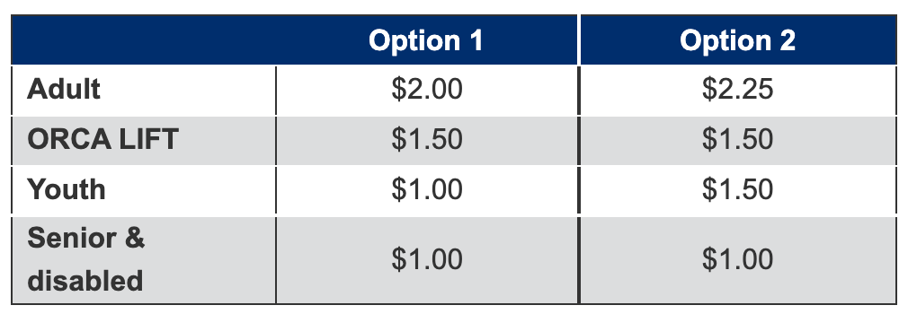Sound Transit’s two fare options essentially differ for the adult and youth costs. Option 1 is a $2.00 adult fare and $1.00 youth fare while Option 2 is a $2.50 adult fare and $1.50 youth fare. Option 1 aligns with Pierce Transit’s current adult and youth fare costs while Option 2 aligns with Central Link’s lowest adult and youth fare costs. Both options propose common $1.00 fares for seniors and disabled persons and $1.50 fares for low-income ORCA LIFT riders.