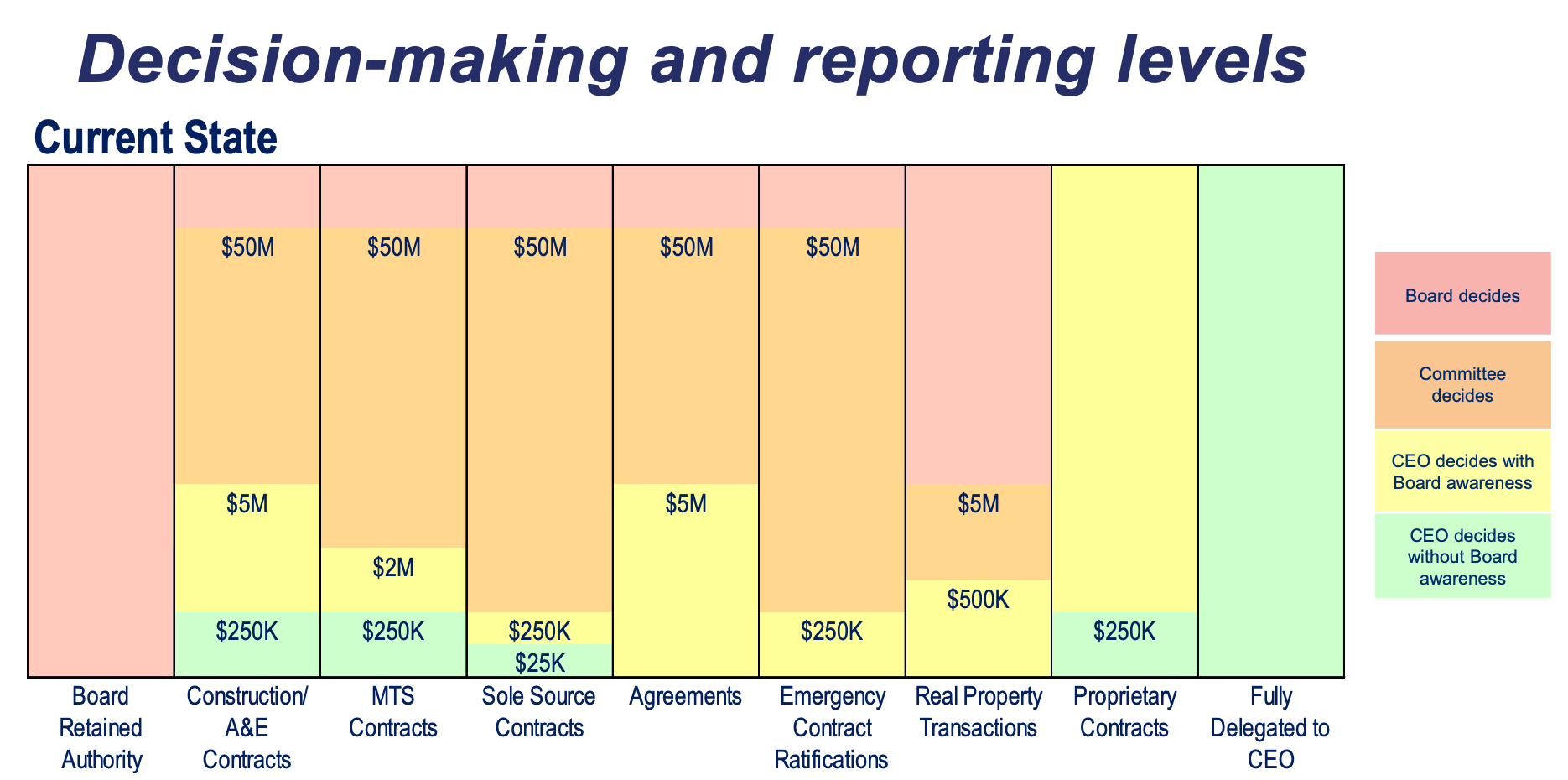 Boardmembers will have to settle on expenditure amounts and circumstances that they are comfortable with the CEO making sole decisions on, but the option seeming to have the backing of committees is expected to reduce approvals by 9% in the System Expansion Committee and 35% in the Rider Experience and Operations, which translates to about 17 actions per year.