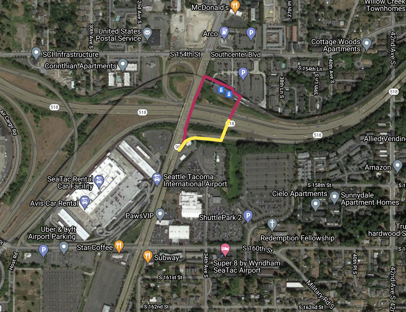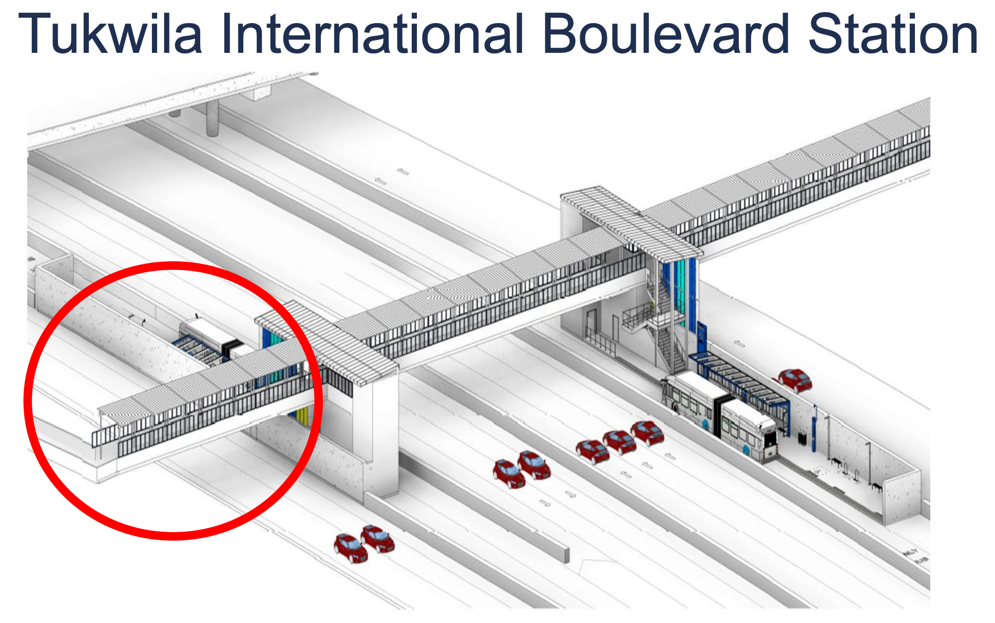 The biggest station access savings would come from building half a pedestrian bridge over I-405 at Brickyard Station, which would allow riders to only reach the Brickyard Park-and-Ride from the freeway median station. Agency estimates suggest that 1,500 riders are expected to use the station on any given day by 2042, but cutting off the eastern side of the pedestrian bridge would discourage riders from the east side, which has some of the best potential for walk-on and bike-on riders. In fact, this connection has the opportunity of better tying the two halves of the Tolt Pipeline Trail together.Eliminating the eastern half of the bridge would mean that people walking, rolling, and biking would have to travel 2,800 feet instead of 100 feet just to reach the same point on the east side of I-405; to put it in context, that’s nine minutes of walking time instead of a mere 30 seconds. Sound Transit is considering forgoing the eastern portion of the bridge based on estimates that suggest the savings could be in the range of $10 million to $15 million.Smaller savings could come from the planned Stride station at Tukwila International Boulevard, which would connect to the existing Link light rail station. A pedestrian bridge had been proposed in three parts over SR-518 with one end connecting the light rail station and the other to the south side of the on-ramp that leads to Tukwila International Boulevard. In between, the bridge would provide access to two Stride platforms on either side of the freeway. However, it’s the southern segment of the bridge that is conceptually proposed to be axed, a decision that could have longstanding negative consequences for transit-oriented growth in the area.The Tukwila International Boulevard Stride station is expected to serve some 3,000 daily riders by 2042 with most transferring to the Link 1 Line and RapidRide A and F Lines. As far as the nearby land use pattern goes, development south of the freeway is mostly parking lots and strip malls with street patterns that ensure very long walking distances to the nearest housing. These factors likely influenced Sound Transit’s thinking for the cutback, but skipping out on a pedestrian connection in this location all but guarantees a continuation of this land use pattern and will force area workers and residents to walk longer distances or even encourage them to drive. Forgoing the southern bridge connection would mean a five-minute walk instead of a two-minute walk to the south side of SR-518 and Tukwila International Boulevard in perpetuity.