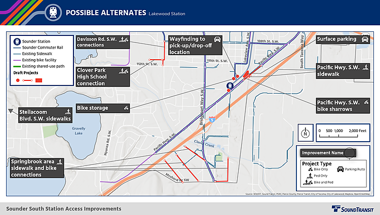 Projects that were eliminated from further consideration include pedestrian and bike bridge on 47th Avenue SW across I-5, pedestrian improvements on Gravelly Lake Drive, and new surface or structured parking.