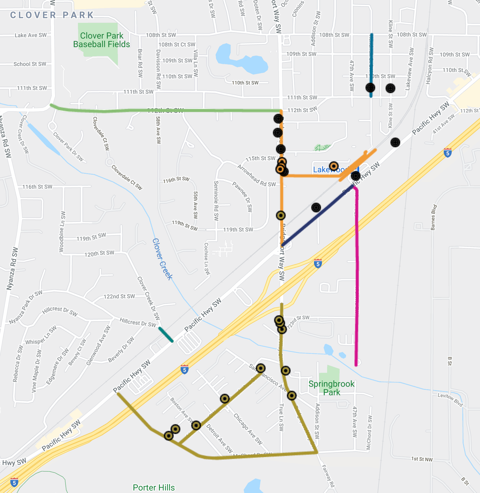 Compared to the South Tacoma Station area, the possible alternatives is somewhat narrow, but still mostly focused on pedestrian and bike improvements. Streets in the Springbrook area would be the biggest beneficiary new sidewalks and bike sharrows. Clover Park High School and Davisson Road SW could also get new bike lanes, sidewalks, and curb ramps.