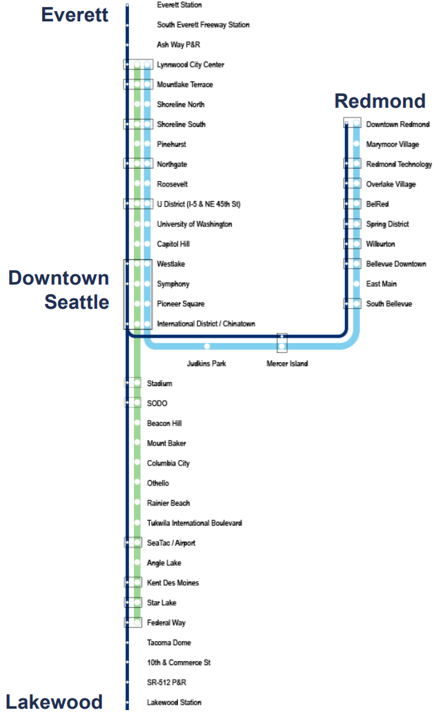 Sound Transit’s overnight network would consist of three routes, all converging on Downtown Seattle: one from Everett, one from Redmond, and one from Lakewood with a stop at Sea-Tac Airport. Along with the Night Owl network, the new coverage would mean 85% of Link stations would be served by overnight service. But planned frequencies are still up-in-the air, and will likely depend on staffing at Sound Transit’s partner transit agencies.