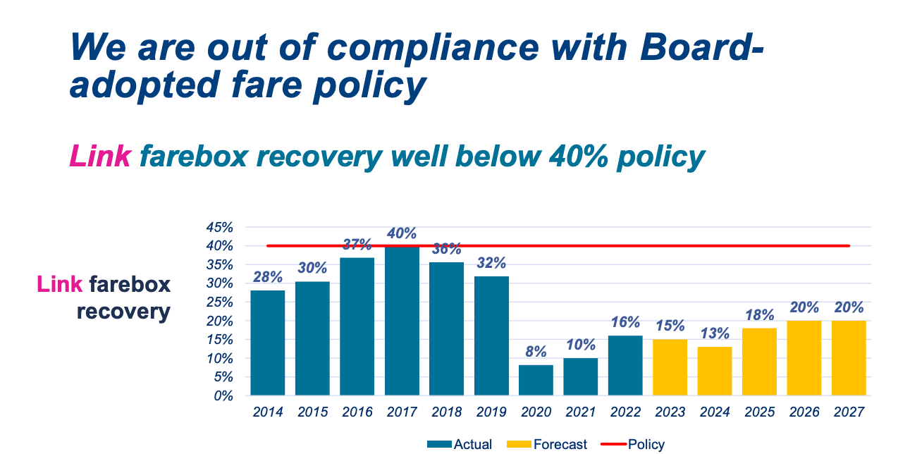 - Link’s farebox recovery target is 40%. Only one year, in 2017, was that rate achieved. Rates fell in the following years and the pandemic drove the numbers even lower. In 2022, Link only managed to rebound to a 16% farebox recovery rate. That is projected to undulate through 2027 to around 20%.