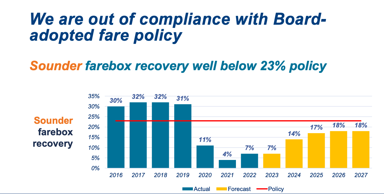 - Sounder’s farebox recovery target is 23%. It was exceeding that consistently prior to the pandemic at around 30% to 32%. In 2021, Sounder farebox recovery rates bottomed out at 4% and hit 7% in 2022. Projections only suggest an 18% farebox recovery rate in 2027.