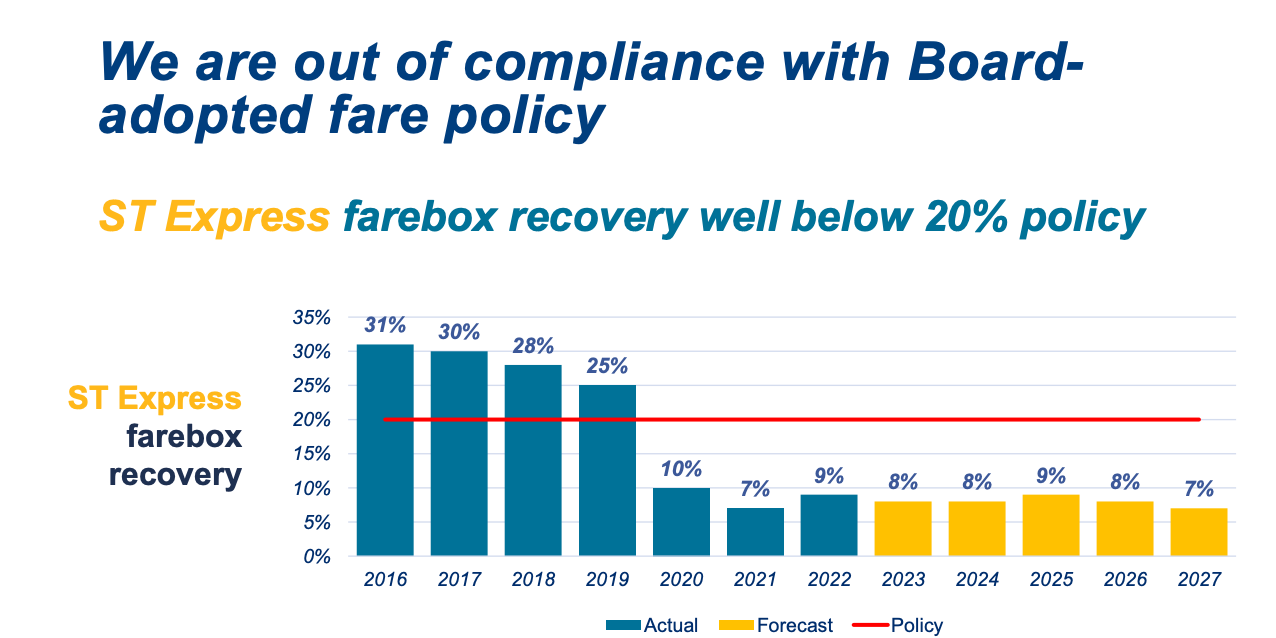 - Similarly, ST Express has a 20% farebox recovery target and consistently outperformed that prior to the pandemic. It bottomed out at 7% in 2021 and reached 9% in 2022, but the projections suggest this may fall back to 7% by 2027.