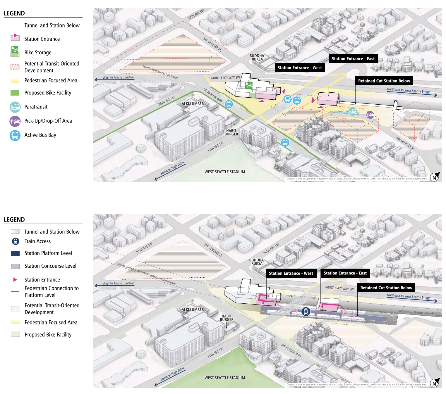 The headhouse on the north side of SW Alaska Street would have a much smaller footprint (eliminating mostly drive-through businesses), but could potentially facilitate similar uses. Zoning in the area could change in the future, potentially as part of a wider station area rezone and planning process.