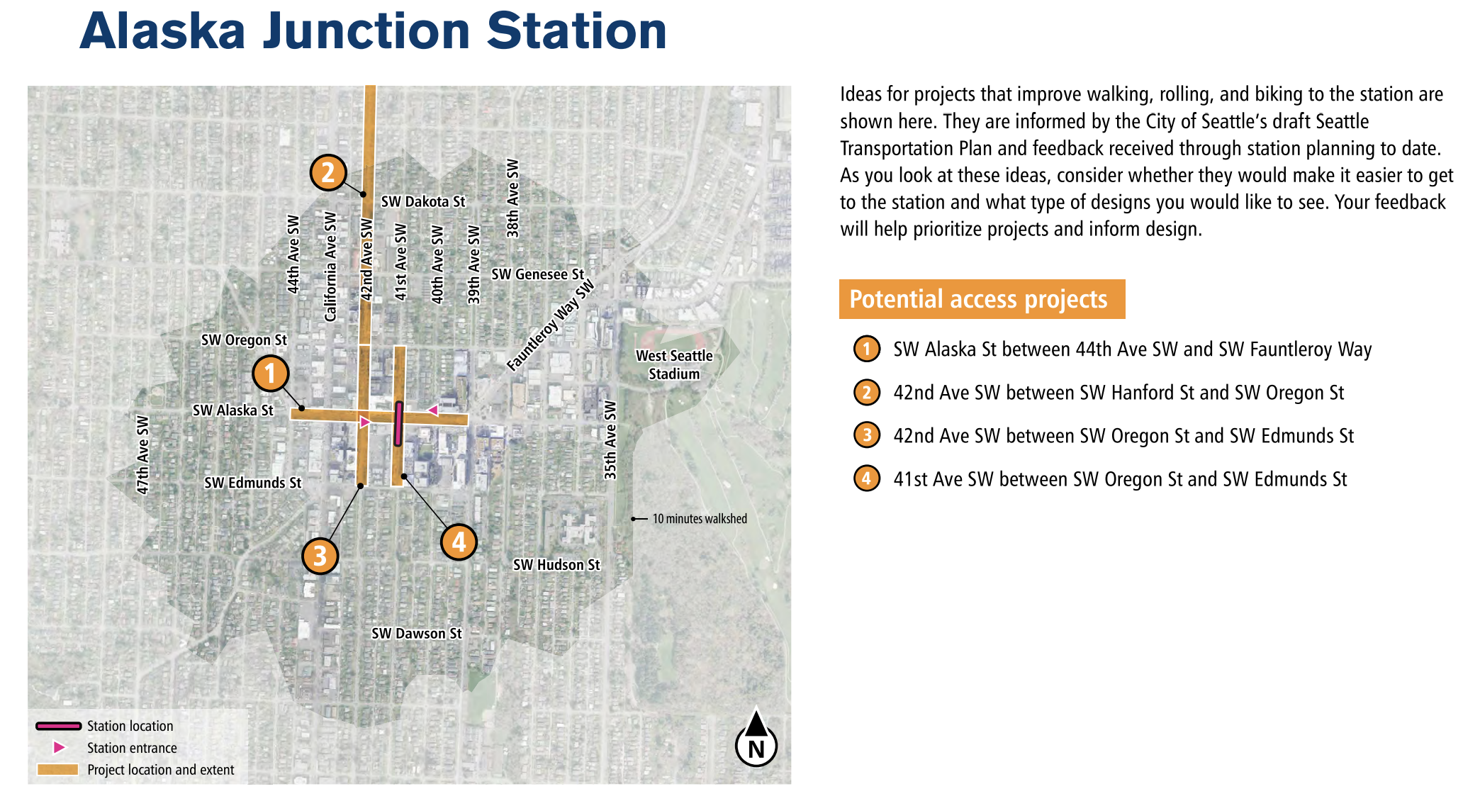 Sound Transit has also identified potential corridors for improved walking, rolling, and biking facilities. Those mostly stretch several blocks in each direction from the station on 41st Avenue SW, 42nd Avenue SW, and SW Alaska Street. The agency is proposing wider sidewalks, protected bike lanes, better lighting, and other streetscape improvements on SW Alaska Street. As for the other streets, Sound Transit is suggesting an extension and enhancement of a neighborhood greenway on 42nd Avenue SW as well as major pedestrian-oriented improvements to 41st Avenue SW, such as wide sidewalks, curb bulbs, landscaping and seating, and flexible spaces.