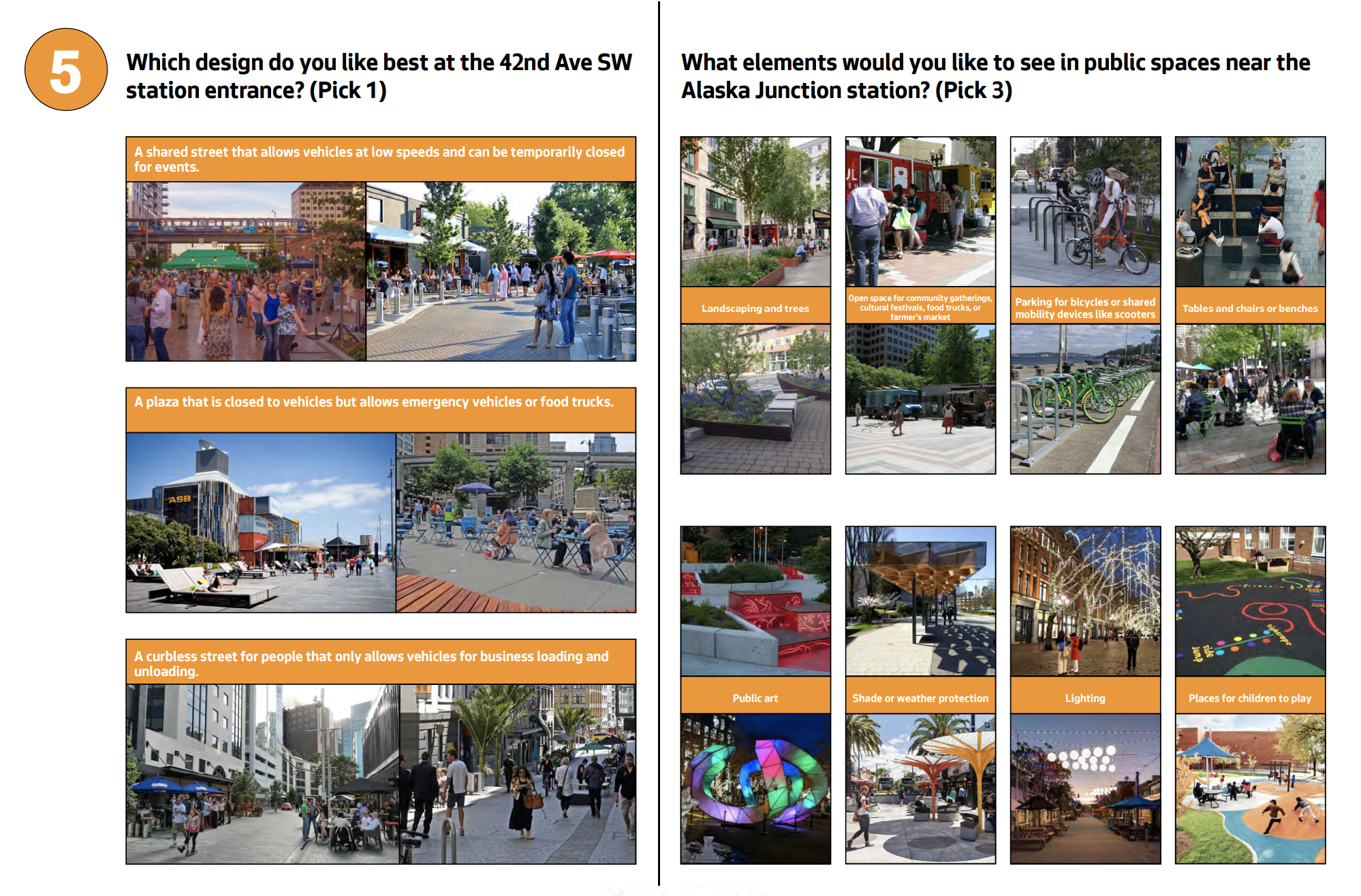 Sound Transit is seeking feedback on what station entrance spaces should look and feel like for the Alaska Junction station. The agency pitched three different ideas for the 42nd Avenue SW station entrance: fronting on a shared street with low speeds (festival street), fronting on a plaza that can be activated, or fronting on a pedestrian street. The agency is considering a variety of amenities within public spaces near the station.