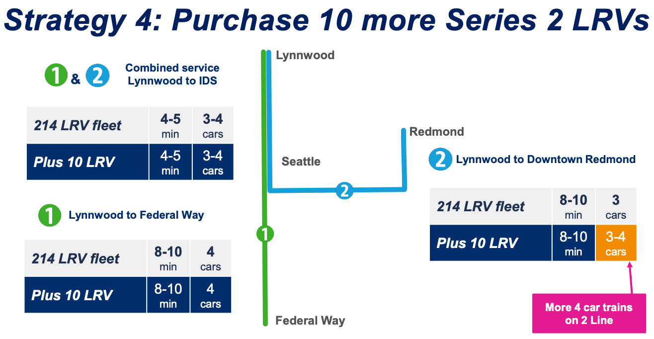 Sheldon outlined a fourth strategy, distinct from the third, that would involve purchasing additional trains sooner than anticipated and running all 1 and 2 Line service to Lynnwood. To do this, the agency would essentially accelerate some orders it would have made for Series 3 trains by buying 10 additional Series 2 cars. Sound Transit expects to see last delivery of Series 2 cars in 2027, but the extra cars could be tacked on to the current order. “Having these additional cars earlier would help us run four-car trains on the 2 Line more often, which would increase capacity on the system and help with crowding between Downtown Seattle and points north,” Sheldon said.