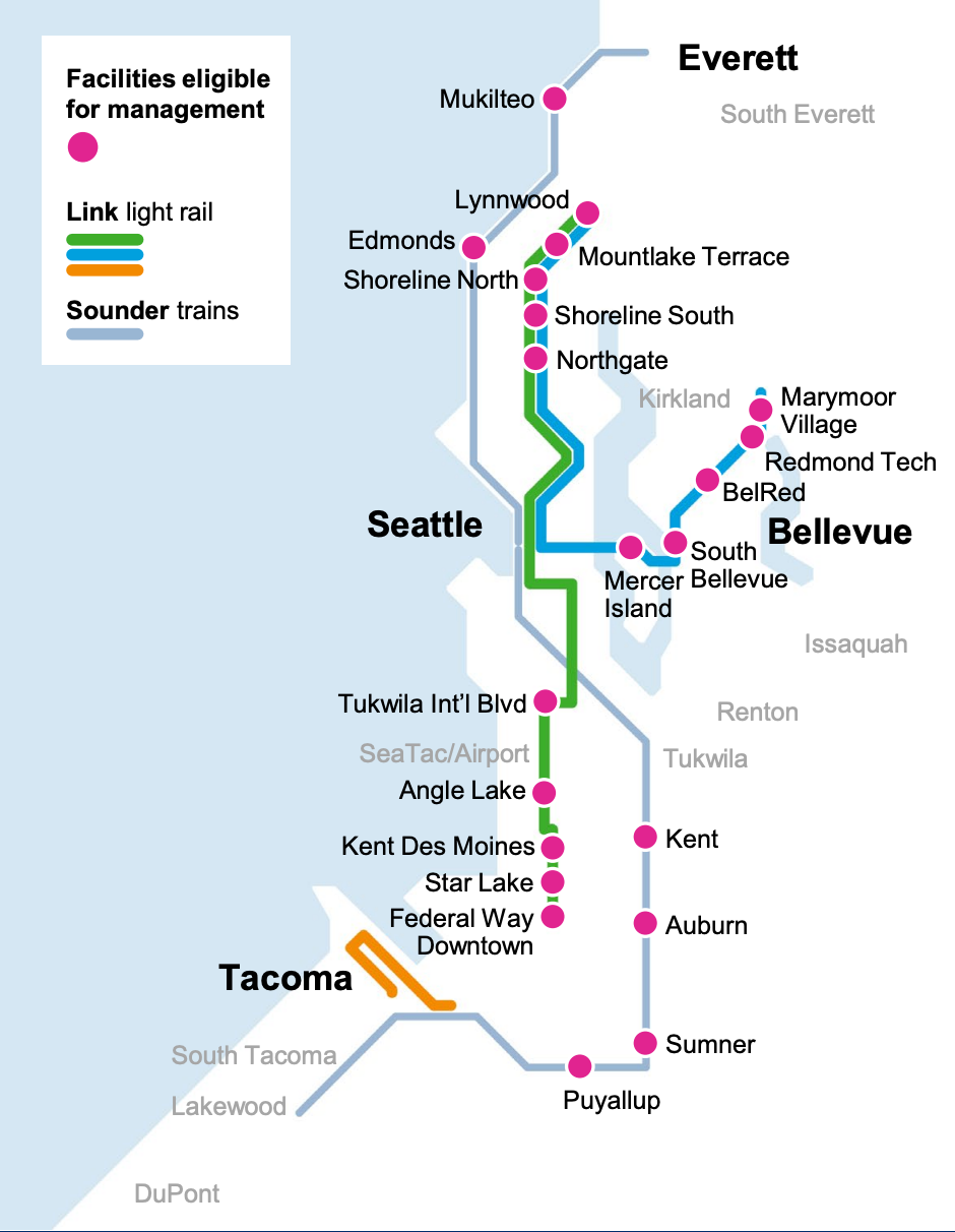 By 2026, Sound Transit would greatly expand the program to a projected 21 facilities along Link and Sounder lines, an expansion based upon agency demand forecasts. Notable locations that wouldn’t be covered by the program are Tacoma Dome Station, which is owned and operated by Pierce Transit, and Everett Station.