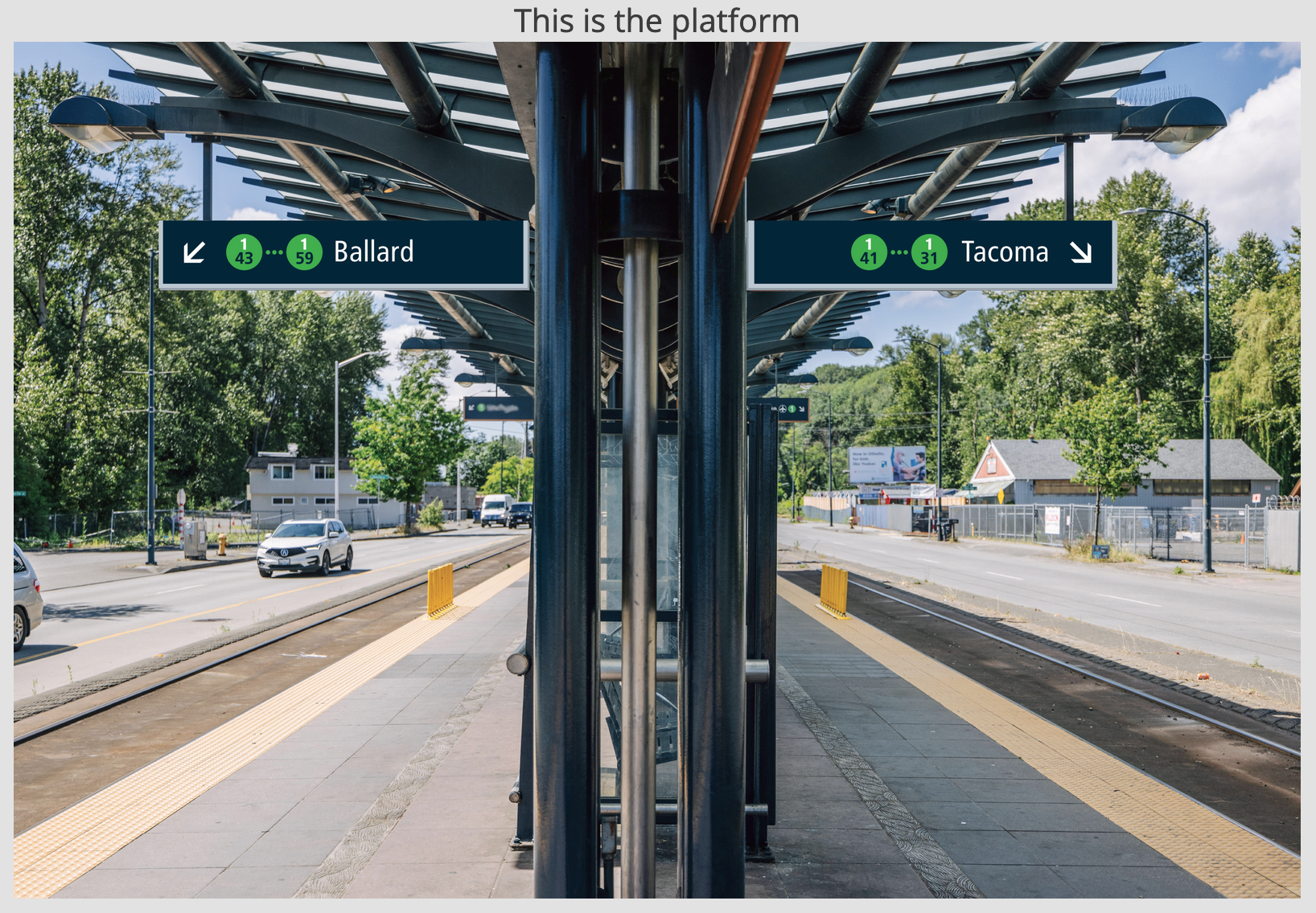 Similarly with the Rainier Beach Station example, the platform signage would show the direction trains are headed with the appropriate terminal station (in this case Ballard and Tacoma) on the 1 Line. In the Ballard direction, stations numbered “43” through “59” would be served whereas stations numbered “41” through “31” would be served in the Tacoma direction.