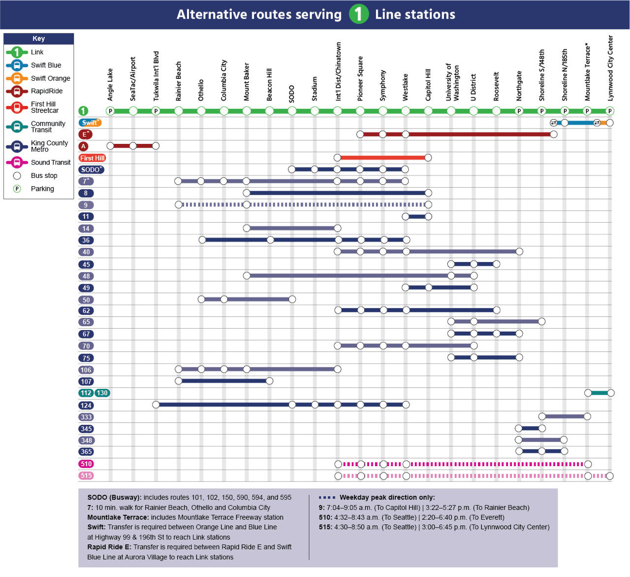 For some trips, alternative transit service options by bus and streetcar may be faster than using Link and its bus bridge connections to reach intended destinations. The agency has a handy diagram offering information on alternative service options for riders to consult. Riders may want to use real-time trip planning apps to calculate their fastest options.