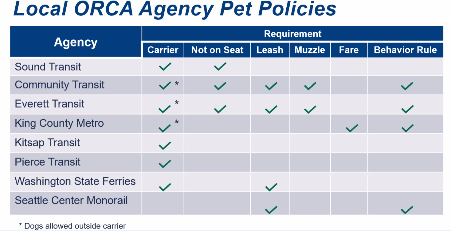 If you want to around on public transit with your very good boy or girl in the Seattle region, you’re faced with a matrix of competing rules across different transit agencies when it comes to whether pets are allowed on board. On Community Transit buses in Snohomish County, dogs and cats must be in a crate, or have both a leash and a muzzle, and can’t occupy a bus seat. On Kitsap and Pierce Transit, dogs aren’t allowed outside of a carrier at all. On King County Metro buses, dogs aren’t required to be in a carrier or even have a leash or muzzle…but large dogs are required to pay a fare, at least on paper.