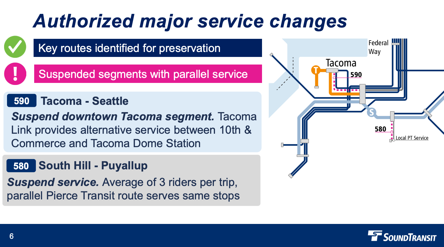 Route 580, which runs from South Hill Park & Rider and Puyallup station as a shuttle for Sounder trains, will no longer operate. The route is only averaging about three riders per trip with two to four trips in each direction. Plus, Pierce Transit already serves common stops with a much higher level of frequency via Route 400.