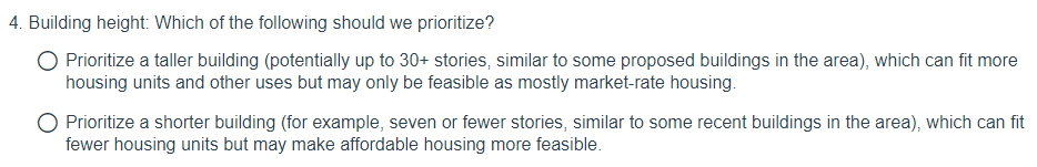 After a demographic sampling, the survey asks a handful of more substantive questions about a potential building. Sound Transit first asks about principles. A solid six and an “other” options are given for survey takers to pick (up to three). Affordability quantity and depth, environmental friendliness, maximized housing capacity, pedestrian experience, space for commercial uses are among the named principles that the agency is weighing. Participants are later asked about the mix of commercial and residential uses, and the size of each unit.
