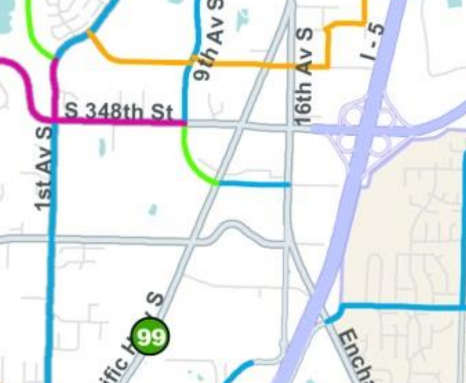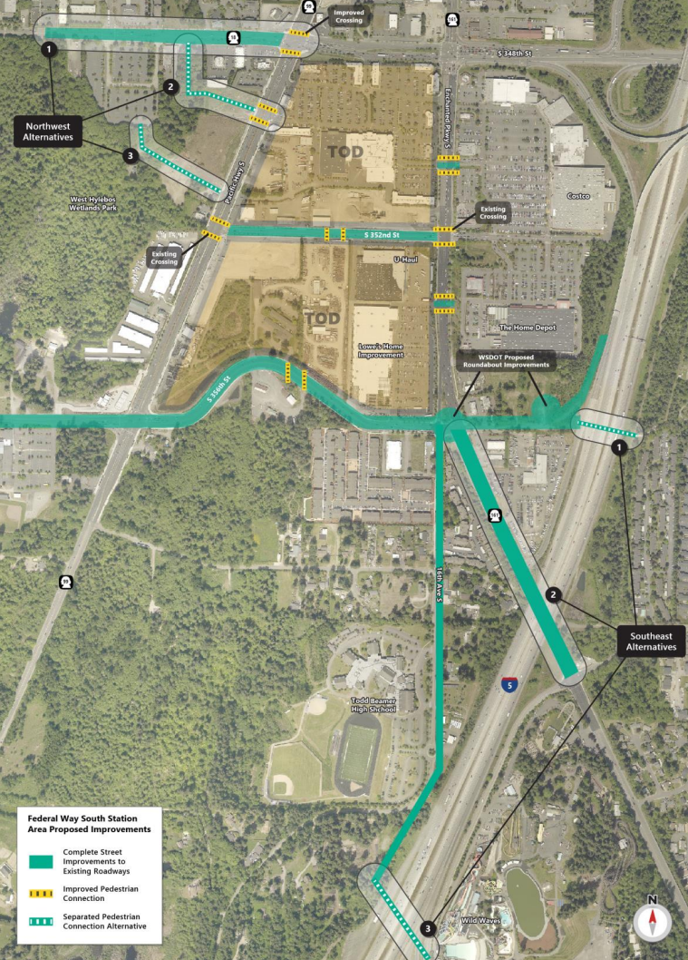 An area dominated by big box retail stores and sprawling parking lots, South Federal Way’s planned transit-oriented development (TOD) area is wedged between Pacific Highway S (State Route 99) and I-5. Other state highways including Enchanted Parkway S (SR 161) and S 348th Street (SR 18) all converge in the area, making it a daunting place to navigate on foot. Bike facilities are essentially nonexistent except for a few gutter bike lanes marked only with paint. Transit service is very sparse — and with the start of light rail service over a decade away, that’s unlikely to change anytime soon.