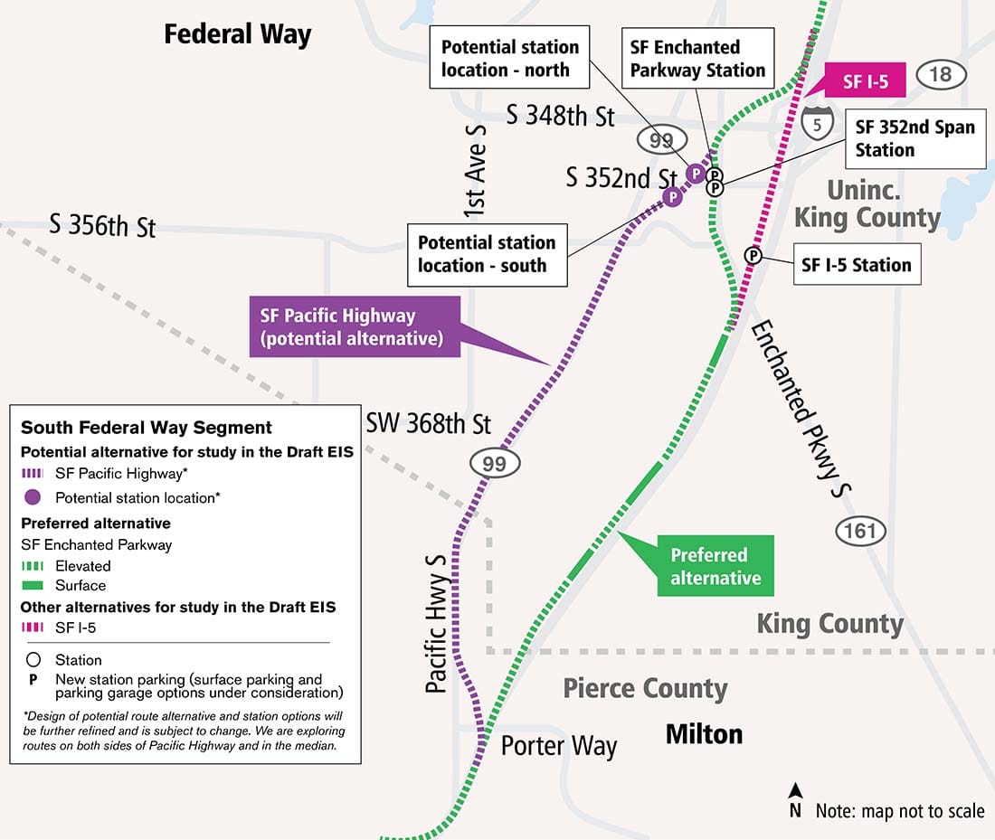 Sound Transit’s current trajectory will add a station near Enchanted Parkway and S 352nd Street, directly in the middle of the area being eyed for redevelopment. Where exactly the station ends up depends on the alignment selected for the segment to the south, as the line heads into Fife.
