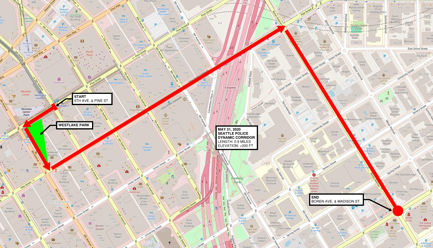 At this moment, King County Sheriff helicopter footage shows SPD opening their barricades, and allowing protesters to flow into Westlake Park and into the restricted Public Safety Zone. Once corralled, SPD appeared, not to disperse the crowd, but to trap them and herd them to a point about a mile away, up Pine Street, up Boren Avenue, then up Madison Street.