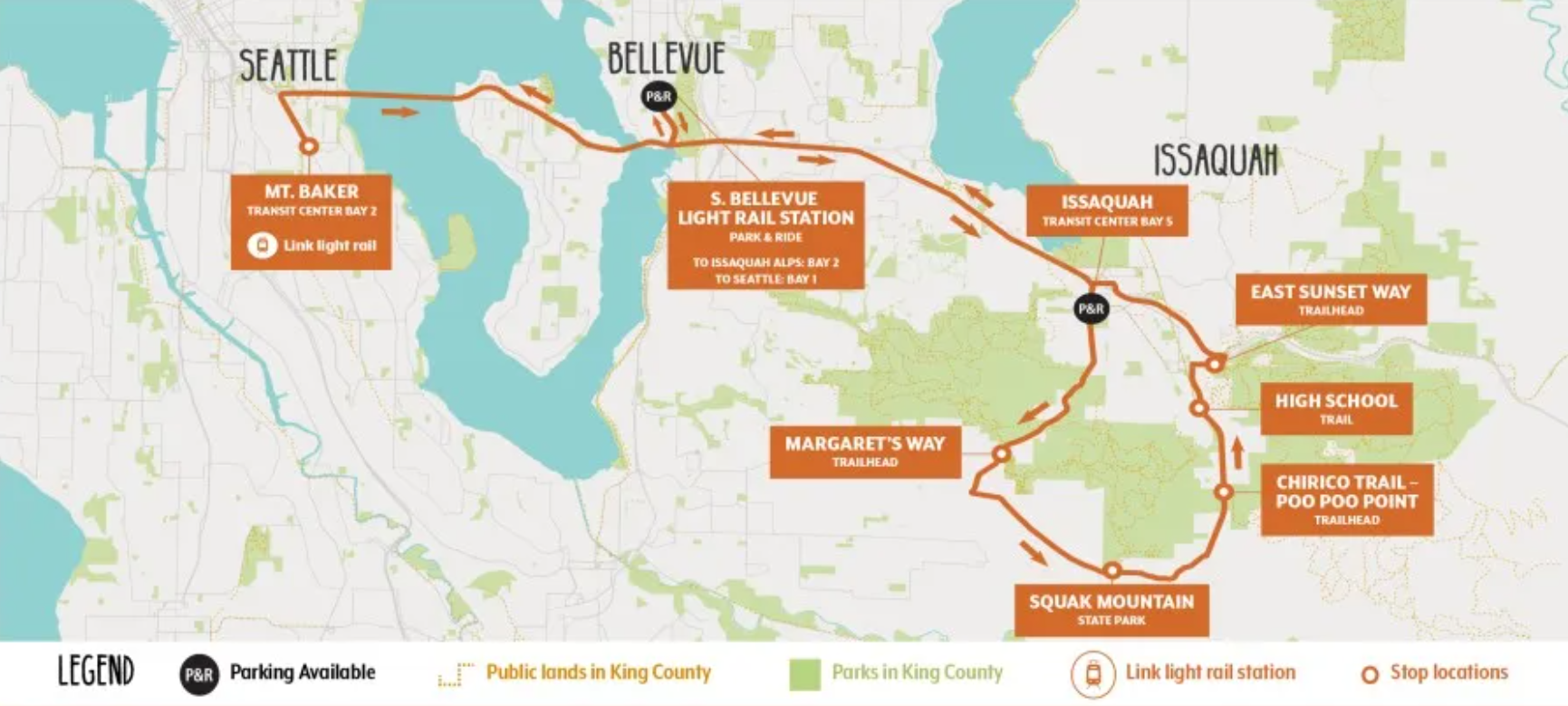The big change this year is that both routes will stop at the South Bellevue 2 Line light rail station, connecting Trailhead Direct trips with 10-minute all-day service into Downtown Redmond. But the Issaquah Alps route will also see a big increase in frequency, with buses arriving every 30 minutes compared to every hour last year.