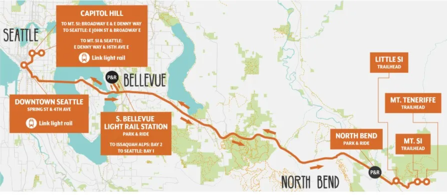 King County’s summer hiking shuttle, Trailhead Direct, returns for its 2025 season on May 24, providing half-hourly service between Seattle and popular Eastside hiking destinations on weekends and holidays. The two routes remain the same as in 2024: a shuttle to Mount Si, Mount Teneriffe and Little Si leaving from Capitol Hill, and a shuttle to the Issaquah Alps, serving Squak Mountain and Poo Poo Point, leaving from Mount Baker Transit Center.