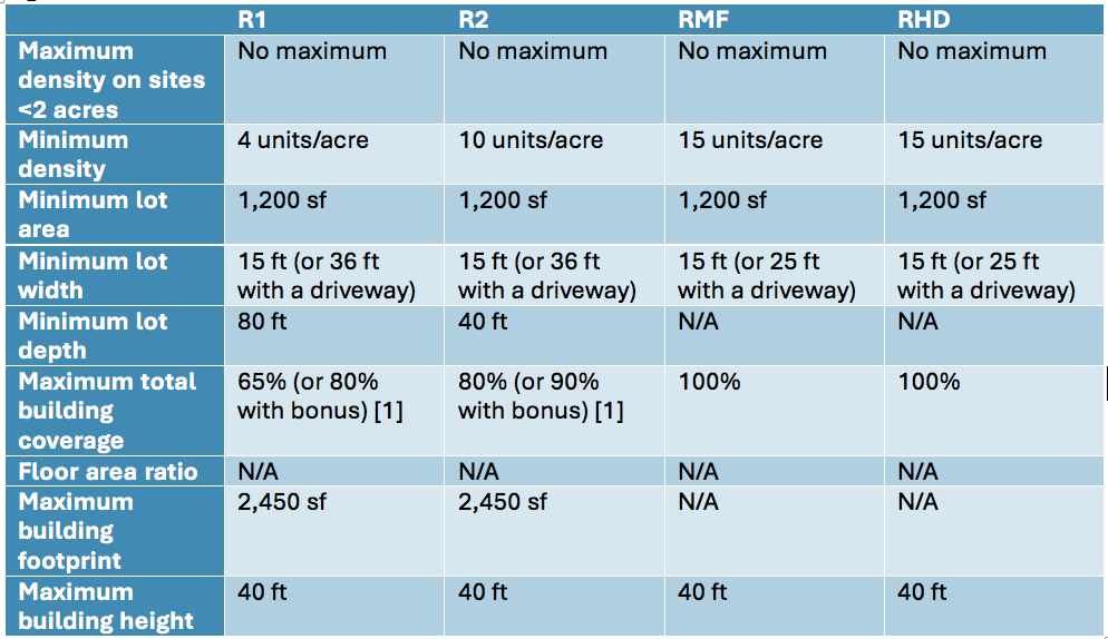 Near transit and mixed-use zones, on properties owned by religious institutions, or specifically for affordable housing, developers can boost the lot coverage of their projects to 80% even in R1 zones to unlock additional development capacity. (Some minimum outdoor space standards still apply.)