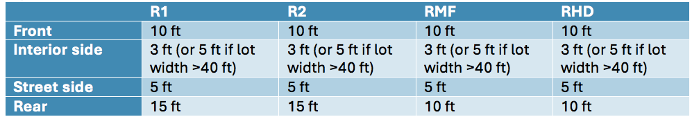 See Figure 1 and Figure 2 below for specifics on the adopted dimensional standards and setback requirements. These charts are simplified from official City versions for readability.