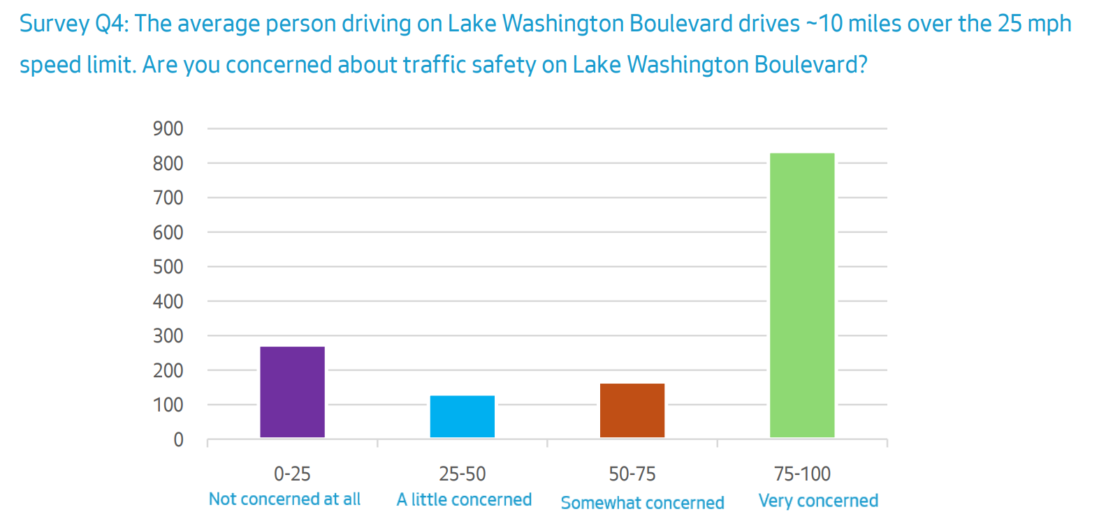 In response to a survey question about how the amount of speeding on Lake Washington Boulevard impacts visitors to the street, the vast majority of respondents said it made them “very concerned.” People biking on the street have long reported being passed dangerously by drivers, but until now there was very little infrastructure in place to address this.