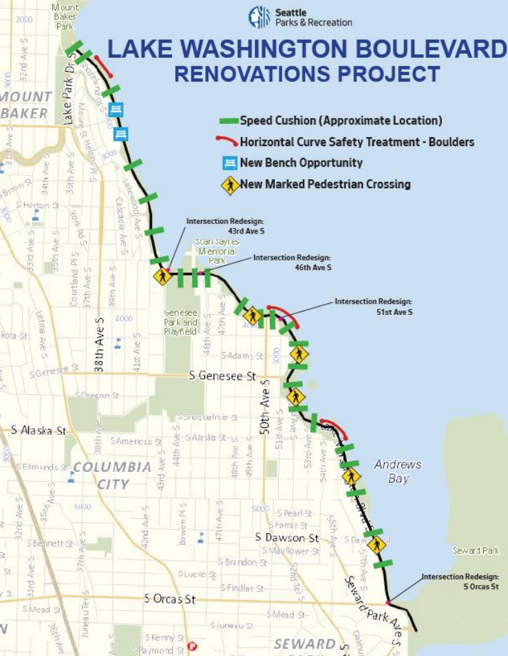Thanks to a grant from Washington’s Transportation Improvement Board (TIB), the scope of the project has expanded since initial plans were presented last year, with an initial set of improvements now set be installed this fall and a second phase in 2025. What was originally set to be 10 speed cushions added between Mount Baker Beach and Seward Park will now be 24 cushions.