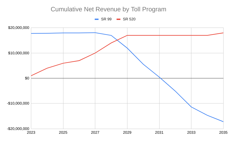 For SR 99, thanks to these recent financial shifts, the balance sheet for the tolling program is expected to remain stable for the next few years, with the revenue generated from tolls directly offsetting costs. But before the end of the decade, those costs are projected to grow faster than revenue coming in, reducing the cumulative amount on the toll program’s balance sheet every year until it’s projected to go negative in 2032.
