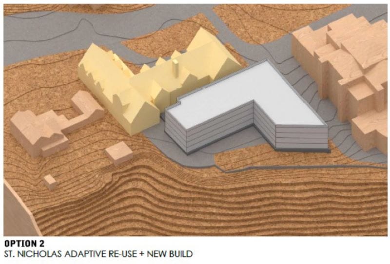 St. Mark’s has worked with the architecture firm atelierjones to create a range of options, and is leaning towards one which utilizes the height of the historic 1926 St. Nicholas structure, while replacing the later 1950s addition to the complex with five stories of residential units.