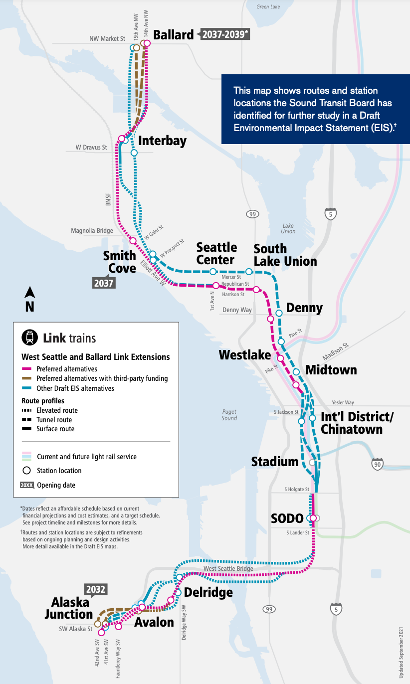 The dual projects are not the same. Extending from SoDo to West Seattle requires construction of the combined SoDo station, then five miles of rail and four new stations. The extension to Ballard has a total of seven miles of new line and nine stations. These go through a brand new downtown tunnel running from the CID through Interbay, with six stations in the tunnel and three stations going up NW 15th Avenue. The new tunnel will cross the existing transit tunnel for transfers at the north and south ends.This complex weaving of tunnels is why there has been so much focus on building a new station in the Union Station/CID area. Any trip switching between tunnels would best occur where all three lines intersect, namely Westlake and Union Station. Those are the places where the tunnels will be closest horizontally, vertically, and to connecting bus and rail lines.