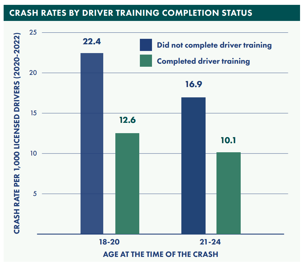 “Novice drivers licensed at age 18-20 years old with no driver training prior to licensure had a 78% higher rate of fatal and injury crash involvement, compared to same-age drivers who had completed driver training,” the plan notes. “Slightly older drivers also showed a significant difference in crash rates between those who have and have not completed driver training. Specifically, drivers age 21-24 who lacked driver education had crash rates that were 67% higher compared to their peers who had completed a driver training course.”