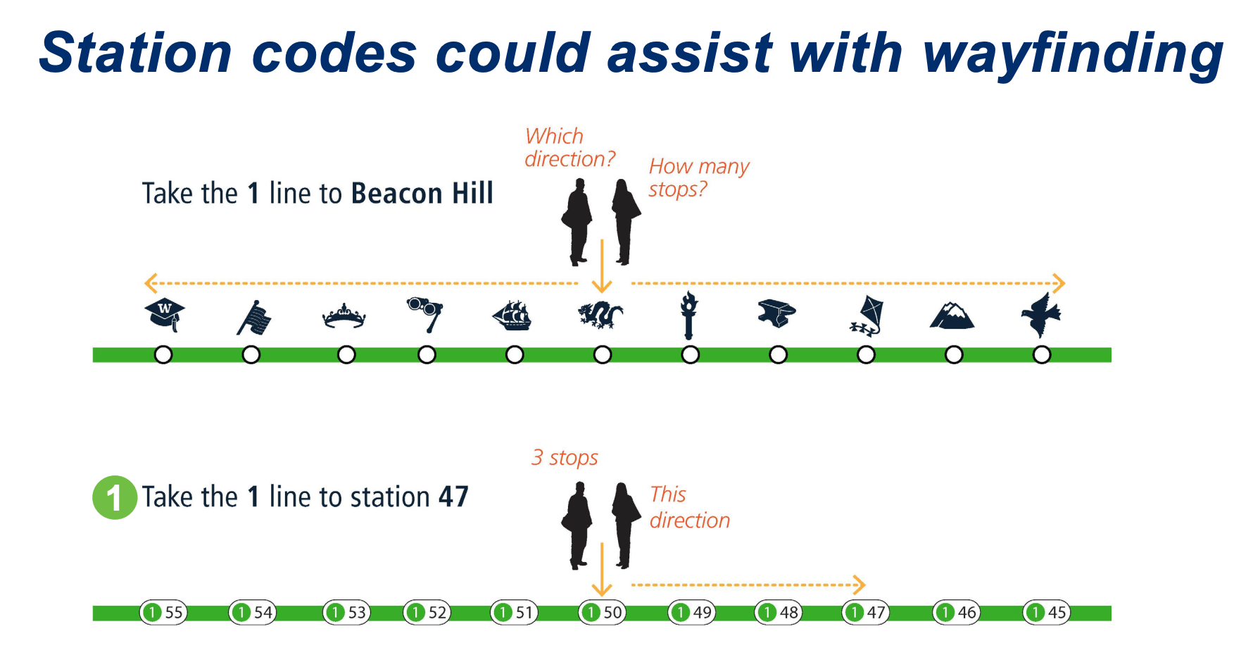 Sound Transit will deploy a new station code system across the Link network for navigation much like sequential numbering systems used for airport gates and major train station tracks and platforms. These will supplement regular station names, not replace them, but the eccentric pictograms (e.g., Roosevelt moose and Capitol Hill pride flag) found in the system will be retired. This decision follows a summer of testing and rider engagement that focused on three different station code design options.