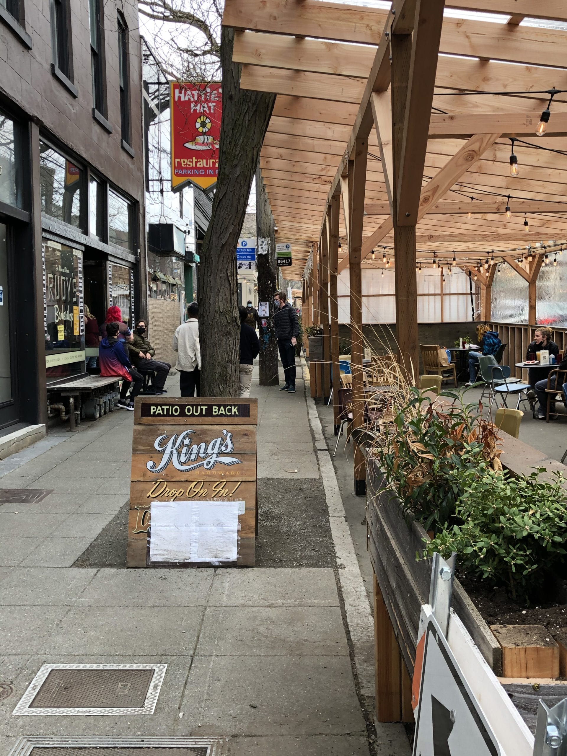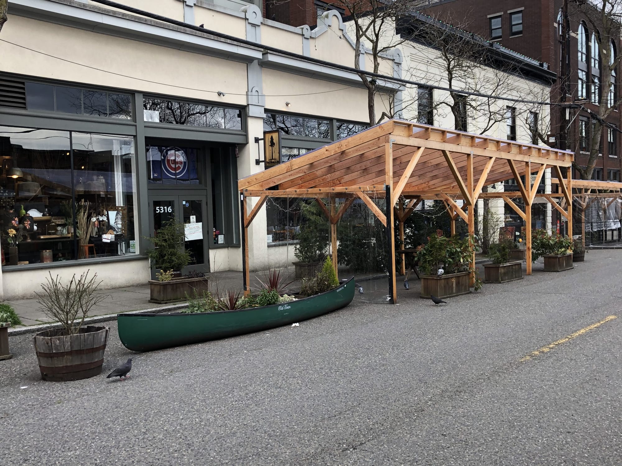The impact of having permits for outdoor dining at least through an entire summer is very visible on Ballard Avenue right now. The first generation of moveable fences and plastic pods are being progressively replaced by more secure and more elaborate wood structures. And canoes. They are not New York’s pandemic snow shacks. What’s being built on Ballard Avenue is more uniquely Seattle. We’ve replaced blue tarp camping with cedar ceiling cafes as an outdoors calling card.