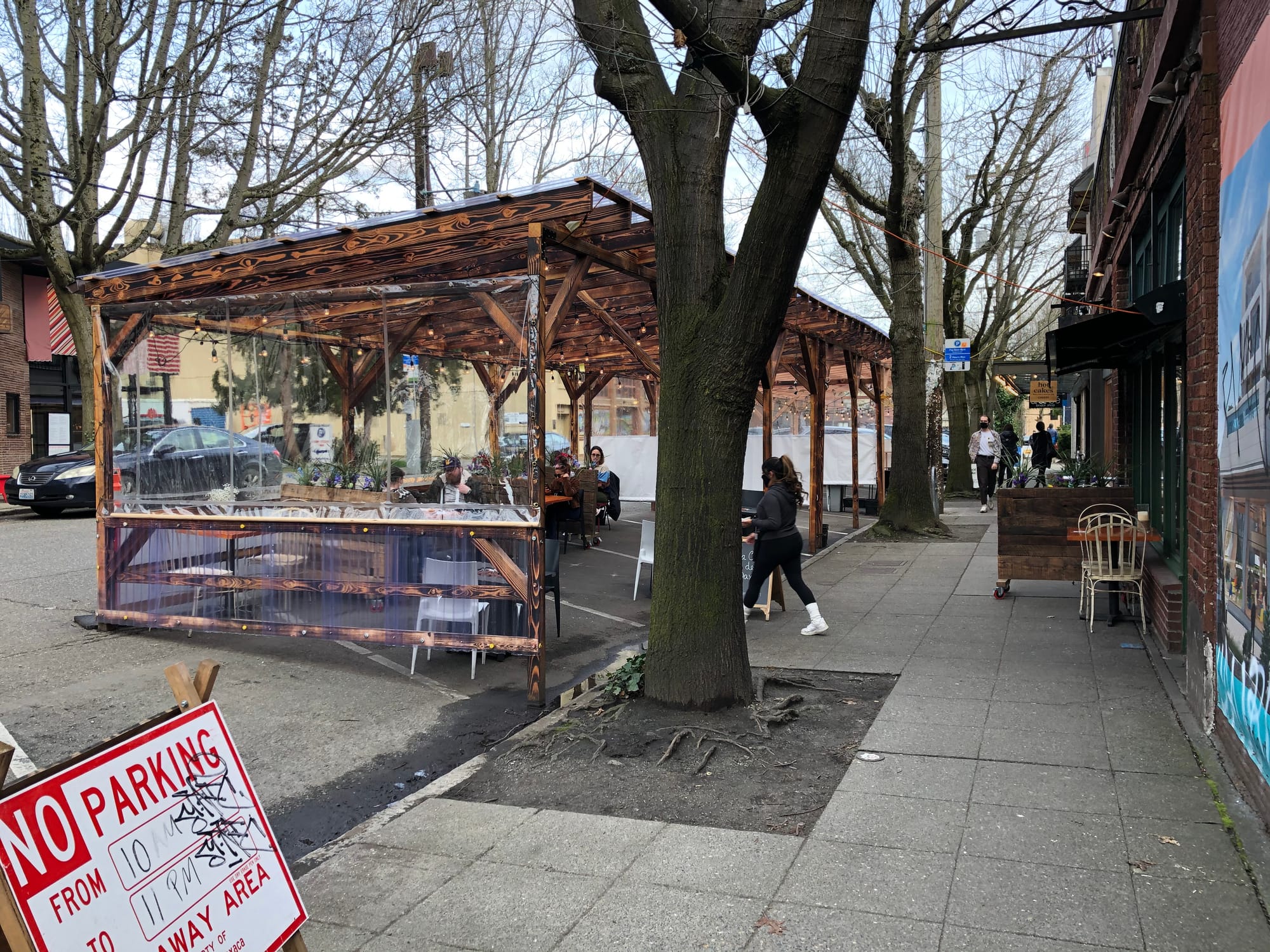 With the boost from pandemic-era legislation, street cafés have become a fixture in a variety of locations across Seattle, such as a popular stretch along Ballard Avenue.