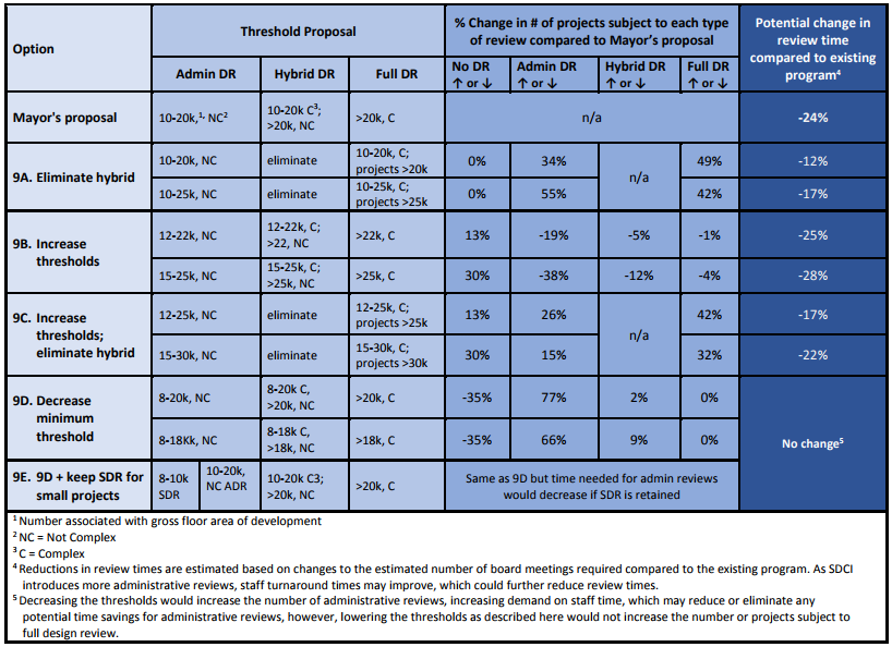 - Amendment 9 would make seemingly minor adjustments to design thresholds but Central Staff believes it could reduce review time by as much as 28% for some projects, which would be helpful. Amendment 9A would eliminate hybrid review, which doesn’t seem essential to the time savings and merits of which are debatable. Increasing the thresholds so that fewer projects trigger full review would be prudent, though.