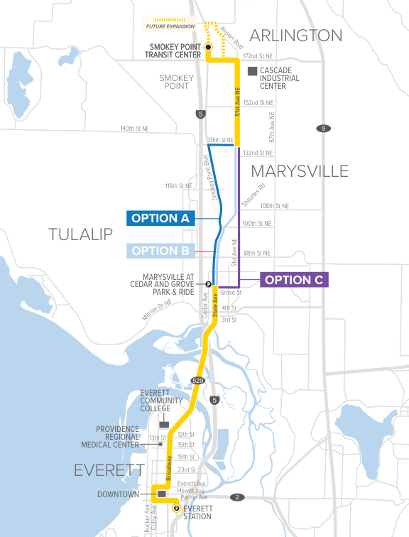 Three alternatives are being studied for the new Gold Line, with the main difference being the routing through Marysville. Starting from Marysville’s Cedar and Grove Park-and-Ride, the alternatives shake out as follows: