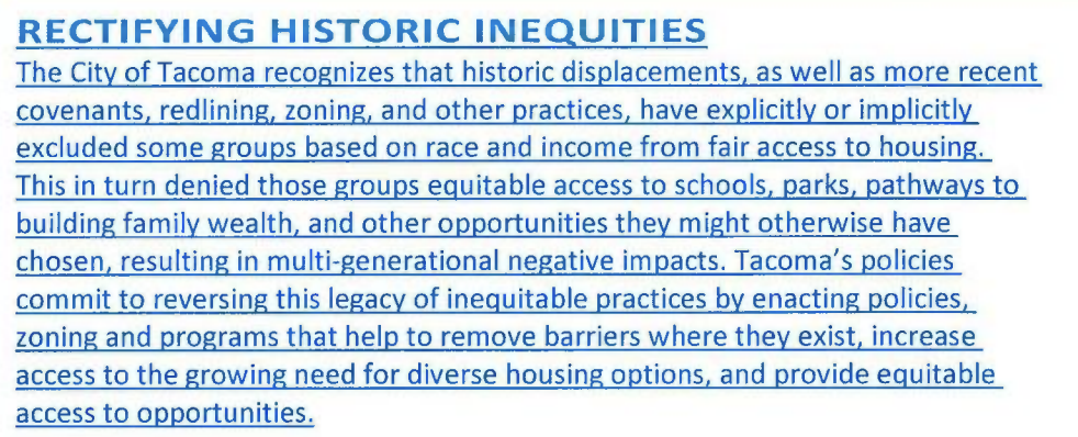 Lastly, the Tacoma City Council incorporated a new section in the Comprehensive Plan highlighting local history in racially-motivated policies and practices that created inequitable outcomes. The Comprehensive Plan now commits the city to working to undo these practices and remove barriers to housing and opportunity for people of color and lower wealth.