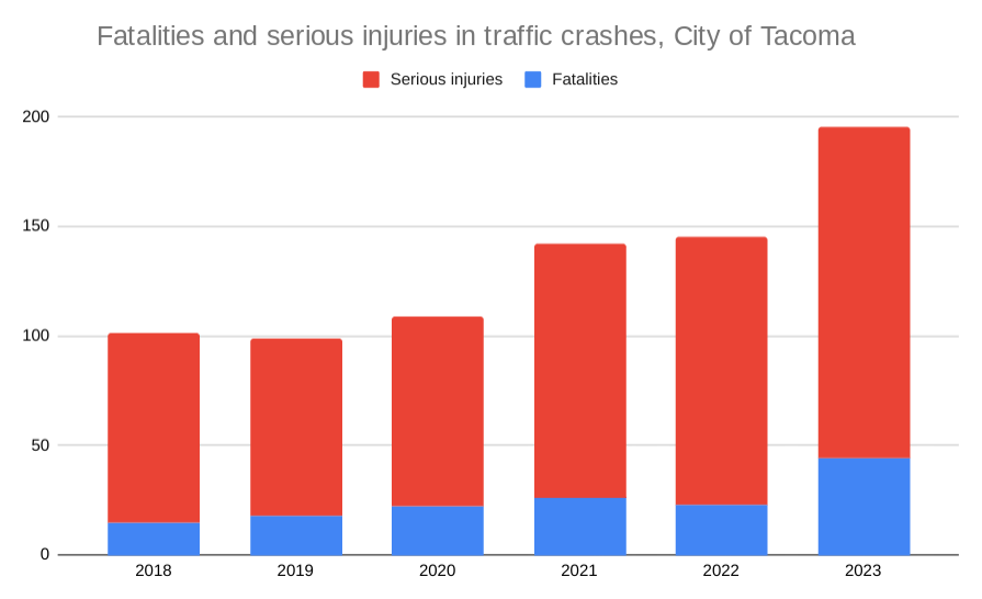 Meanwhile, crashes resulting in death and serious injury continue to rise on Tacoma’s streets, with a 35% increase between 2022 and 2023, according to Washington State Department of Transportation (WSDOT) data.