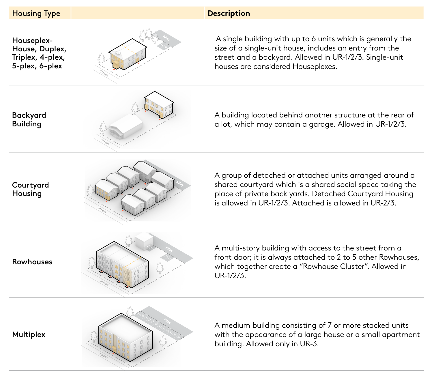 | Allowed Uses1 | Houseplexes, backyard buildings, rowhouses, and courtyard housing (detached) | Houseplexes, backyard buildings, rowhouses, and courtyard housing (detached and attached) | Houseplexes, backyard buildings, rowhouses, courtyard housing (detached and attached), multiplexes |