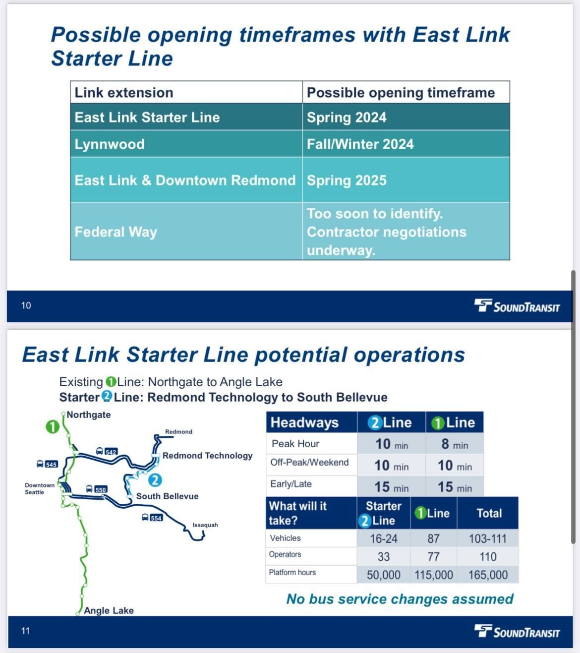To make the spring of 2024 opening for the starter line, the full Sound Transit Board will need to make a decision on the Eastside starter line in January, because there will be 13 to 15 months of mandatory regulatory processes before such a line could open. The board did not make any final decisions thus far. (Christopher Randels will have more on East Link news in a follow-up article, so watch for that.)